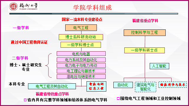 电气工程学科是国家一流本科专业建设点、福建省省级特色重点学科,2018年通过了中国工程教育认证,其中电器专业博士点是全国最早一批建立的电器专业博士点,也是太阳集团tcy8722最早建立的两个博士学位授权点之一。控制科学与工程学科是福建省重点学科。目前,学院拥有电气工程一级学科博士点和博士后科研流动站、控制科学与工程一级学科硕士点、新能源发电与电能变换福建省重点实验室、福建省电器智能化工程技术研究中心、工业自动化控制技术与信息处理福建省高校实验室、福建省电器行业技术开发基地、福建省医疗器械行业技术开发基地、清真食品产业科技创新公共服务平台、福建省研究生培养创新基地和福建省专业学位研究生联合培养示范基地等。电气工程学科在福建省内建立最早,在省内具有最完整学科科研方向与人才培养体系,在国家“双一流”建设中,电气工程学科列入福建省一流学科(高原学科)建设计划。